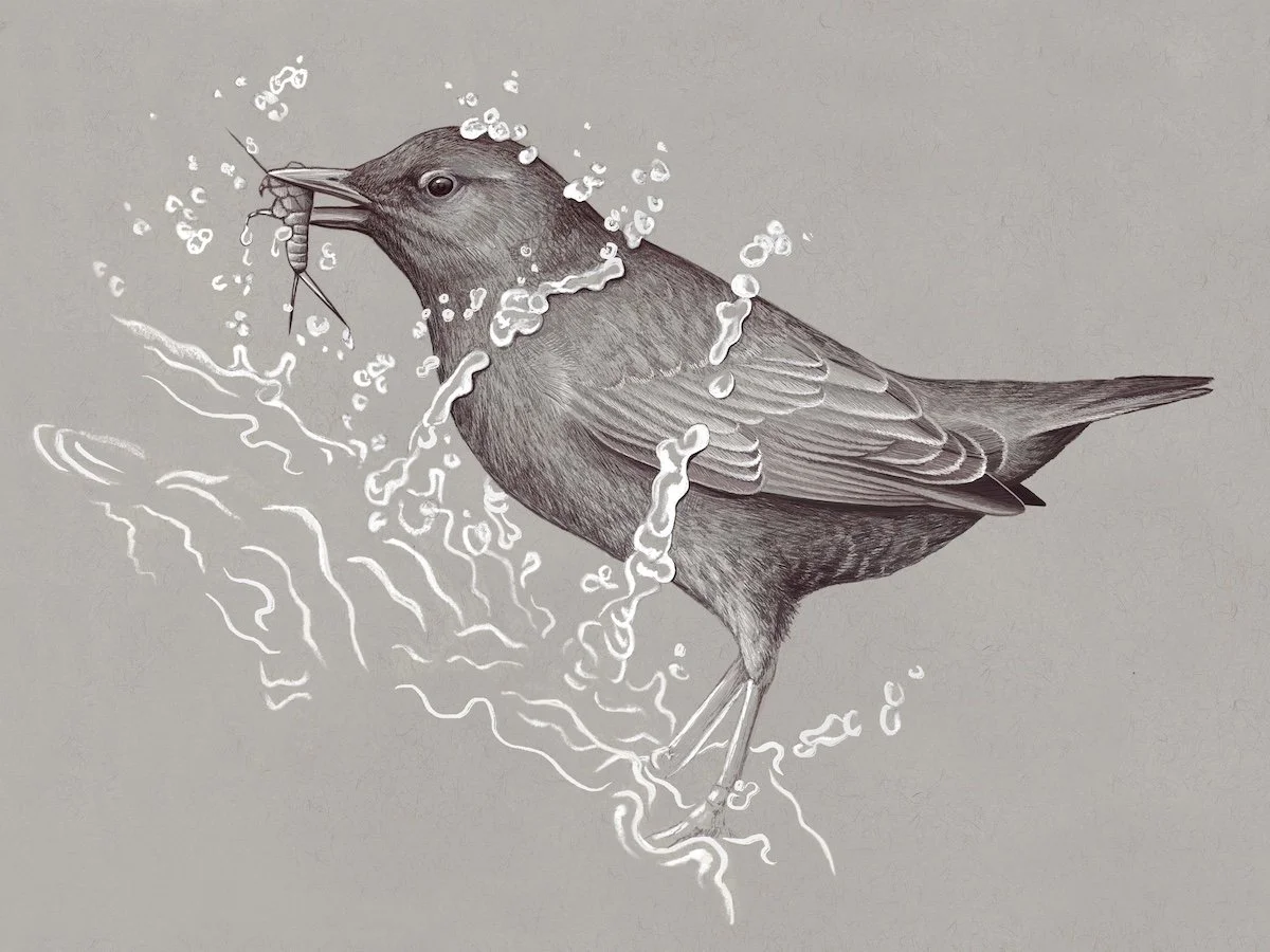 A Black heron displays its umbrella/canopy feeding behavior, surrounded by fellow flora and fauna that can be found throughout the Chobe River watershed in Botswana. My late Aunt Colleen had a long career in international aid, working with the Peace Corps, USAID, and Doctors Without Borders in the Congo, Zimbabwe, and Sudan. She kept a wildlife checklist during a trip to Botswana, which was recently passed down to me. In it, she noted “Umbrella!” next to the Black heron, the inspiration behind this piece. Full species legend here.