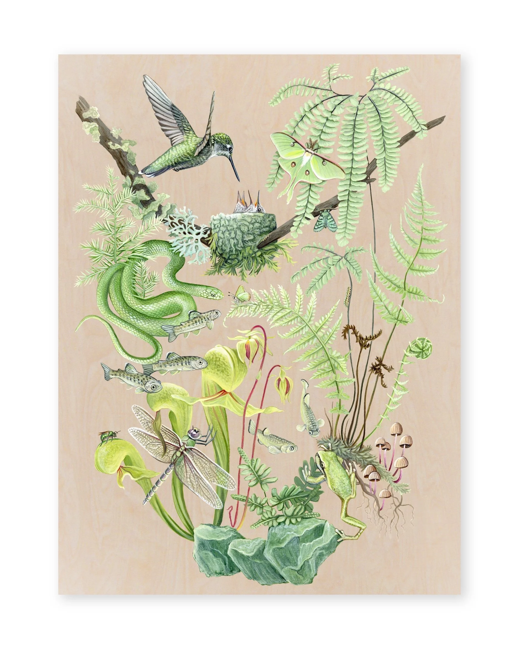 An Anna’s hummingbird tends to her nest amongst vibrant and drying maidenhair and lady ferns. Young steelhead venture from their natal streams to the ocean before returning again, again, and again, all within one lifetime. A chorus frog climbs towards Darlingtonia pitcher plants, who prefer the challenging conditions of serpentine.