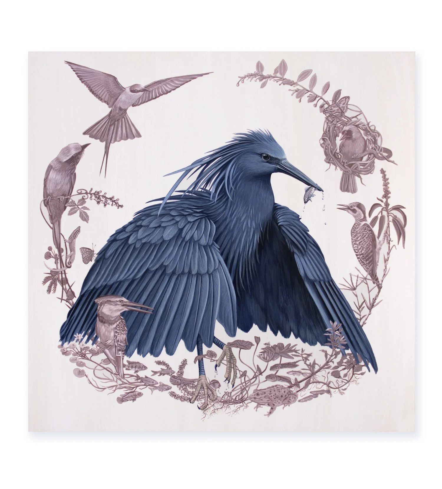 36 x 36 inches; acrylic on birch panel. Thank you to Paul Wheatley for allowing me to study his videos of a Black heron for reference.