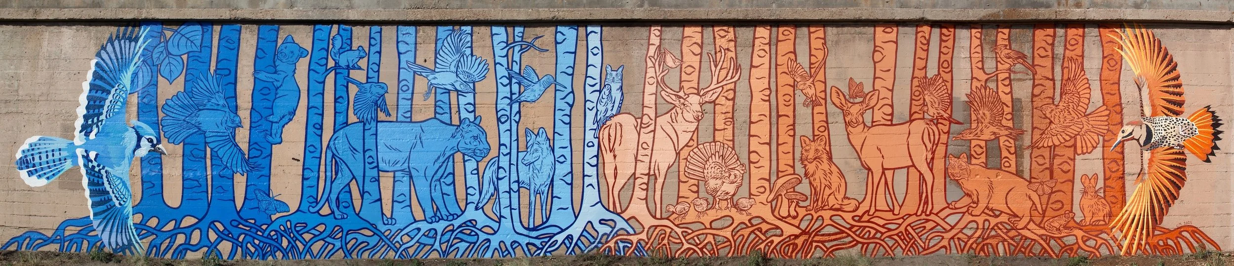 Commissioned by the Sand Creek Regional Greenway Partnership for their 25th Anniversary, this ~3,915 sq ft mural features five large, trompe l’oeil-style field notebooks detailing some of the beings found along the Sand Creek Regional Greenway: Plants and Pollinators, Aquatic Habitats, Reptiles and Amphibians, Mammals, and Birds. Various tools of observation accompany the organisms: hand loupe, pencil, magnifying glass, species checklist, binoculars. Notes, diagrams, and labels in both Spanish and English fill the pages. Community members applied the first layers of paint during our public mural festival, and helped realize this project as a celebration of Sand Creek Regional Greenway Partnership’s dedication to environmental education. Here is a short reflection about the project.